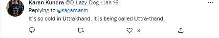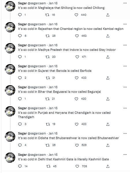 The viral tweets shared by the username @sagarcasm, dub cities of North India which are currently experiencing a cold wave with winter-themed names. The Twitter thread has dubbed Shillong 'Chill-ong,' Chandigarh 'Thandi-garh,' and so on...