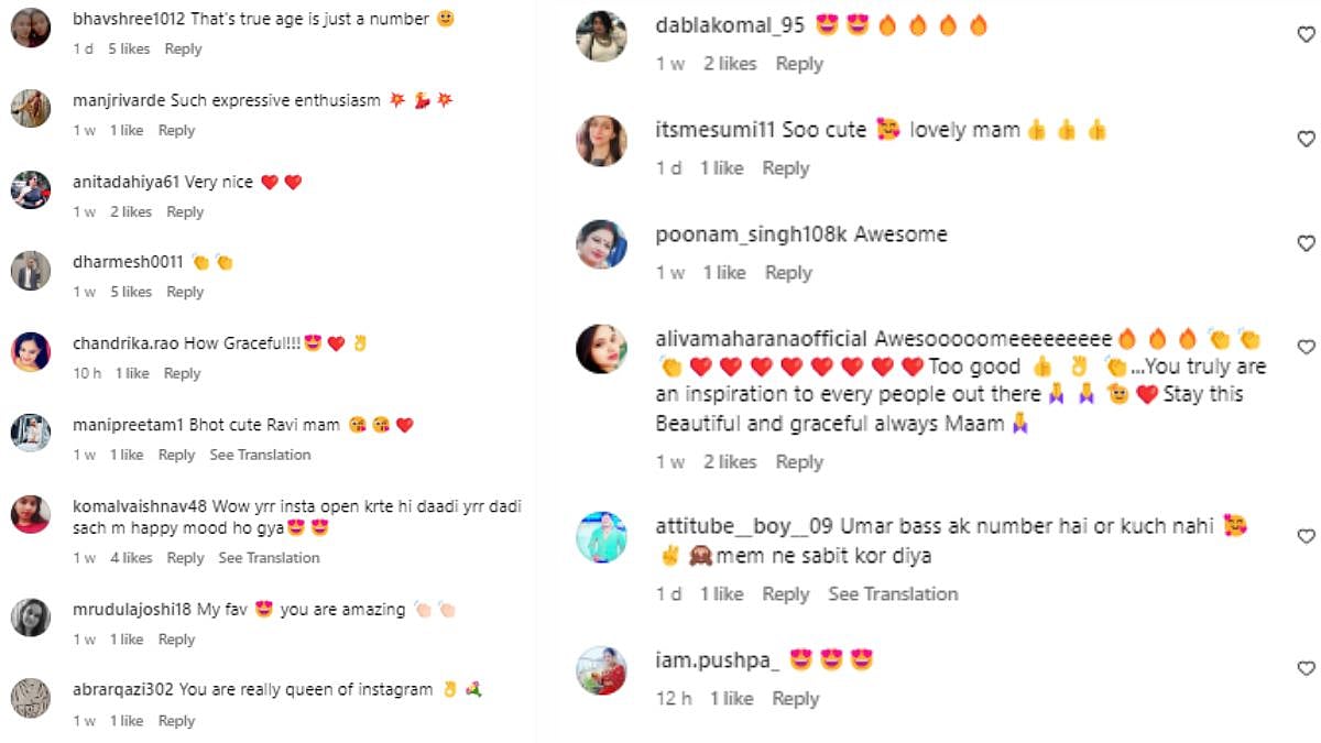 Since being uploaded online, a few days ago, the footage has attracted over a lakh views and thousands of likes. Fans and followers were seen hitting the comments sections to praise her dancing skills and the way she proves that 'Age is just a number' with her being aged 65. "Such expressive enthusiasm," "How Graceful," and "Bahoot cute," comments went on along with heart and fire emojis.