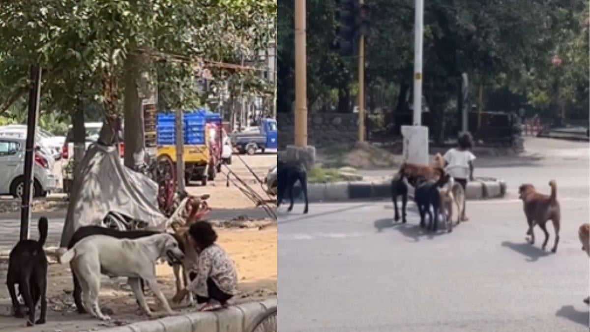 The video, posted by Instagram page 'Tivvvy', shows the girl dressed in a white top and black pants, gently interacting with a group of stray dogs. She leans in to pet one of them, and the dog responds by lifting its front leg toward her.