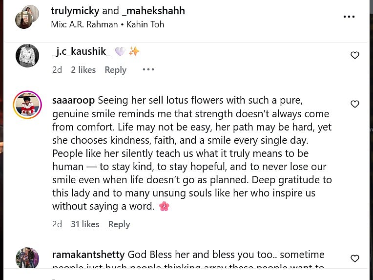 The comment section quickly filled with emotional responses. Many users said the video reminded them of the goodness still present in society, while others admired the woman’s cheerful spirit despite her challenging circumstances. One user said, "Seeing her sell lotus flowers with such a pure, genuine smile reminds me that strength doesn’t always come from comfort. Life may not be easy, her path may be hard, yet she chooses kindness, faith, and a smile every single day."