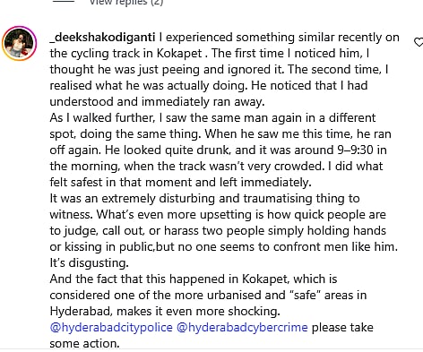 In the viral clip posted on Instagram by user @onseventhsky, the woman described the moment, saying, “I was running and this is like 6 o’clock and at 6:15, this guy was jerking off right at the cycle track. It’s crowded, if you’re in Hyderabad, you know this cycling track is extremely crowded even in the early morning.”