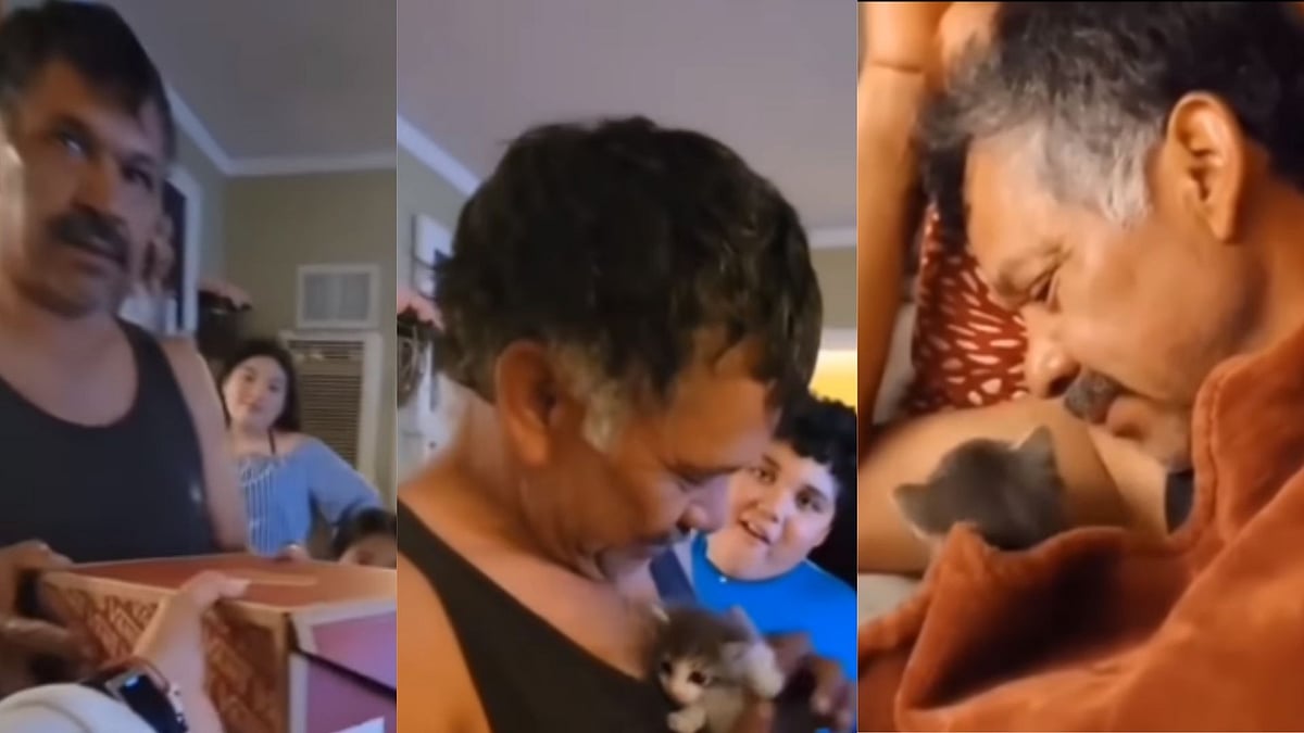 The clip was shared by goodnews_movement with a caption: "This father recently lost his cat that he loved very much was very attached to. His family decided to gift him a kitten and his reaction is adorable. Wait till the end, video gets better and better."