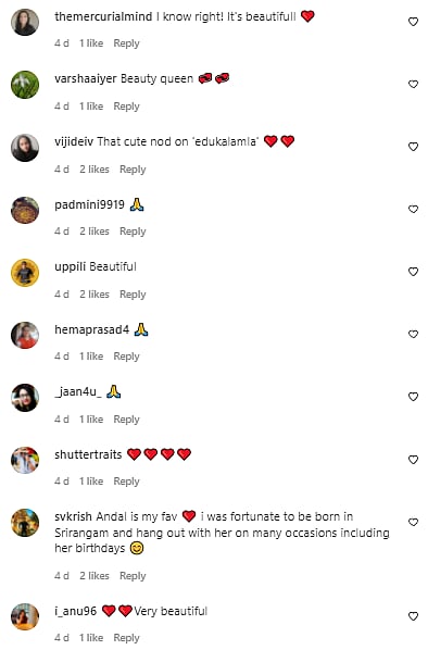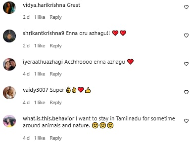 Seeing the affection between the two, Instagram users were in awe. They flooded the comments section for the cuteness in the video. "Beautiful", "Super", "Enna oru azhagu! (what a beauty)" and so on... the comments ran in praise of the relationship the two shared.