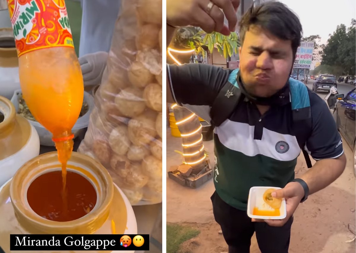 In a video psoted by Instagram user @chatore_broothers, we see a Jaipur based street vendor making Mirinda panipuri. The video begins with the street vendor shaking a bottle of chilled Mirinda to add it to a large container. Later, he simply adds the drink to the puris consisting of aloo stuffing to give it carbonated orange flavor.
