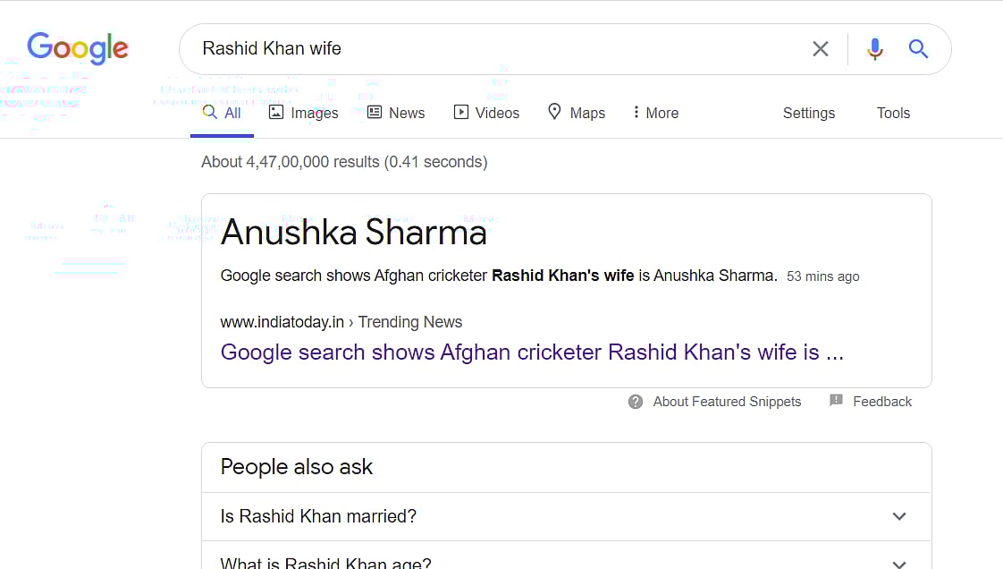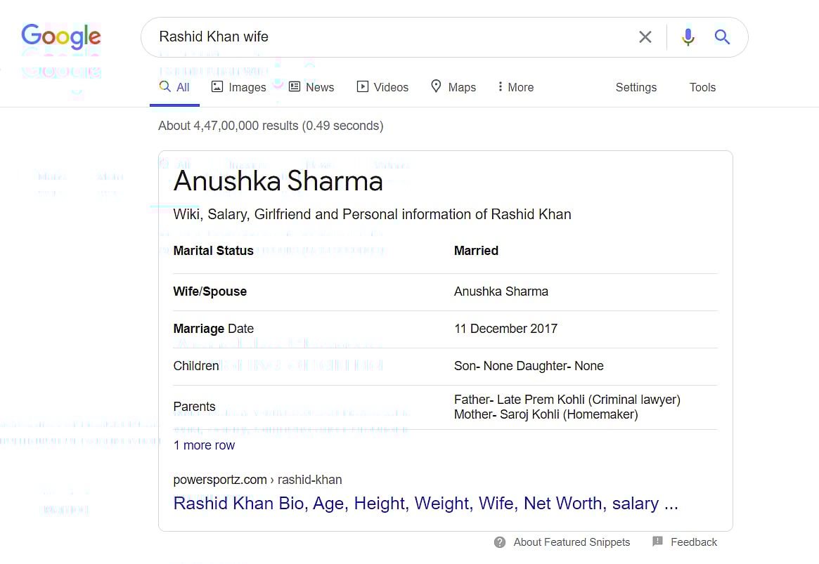 Now, it would seem that Google is suggesting that Afghan cricketer Rashid Khan is married to Anushka Sharma. When one searches "Rashid Khan wife" the instant featured and highlighted response is 'Anushka Sharma'. This search result however has been modified several times today, even as the answer remains consistent. While it had initially provided a short profile of the cricketer while making the incorrect claim about his marital status, it then proceeded to quote a fake website report about the same.