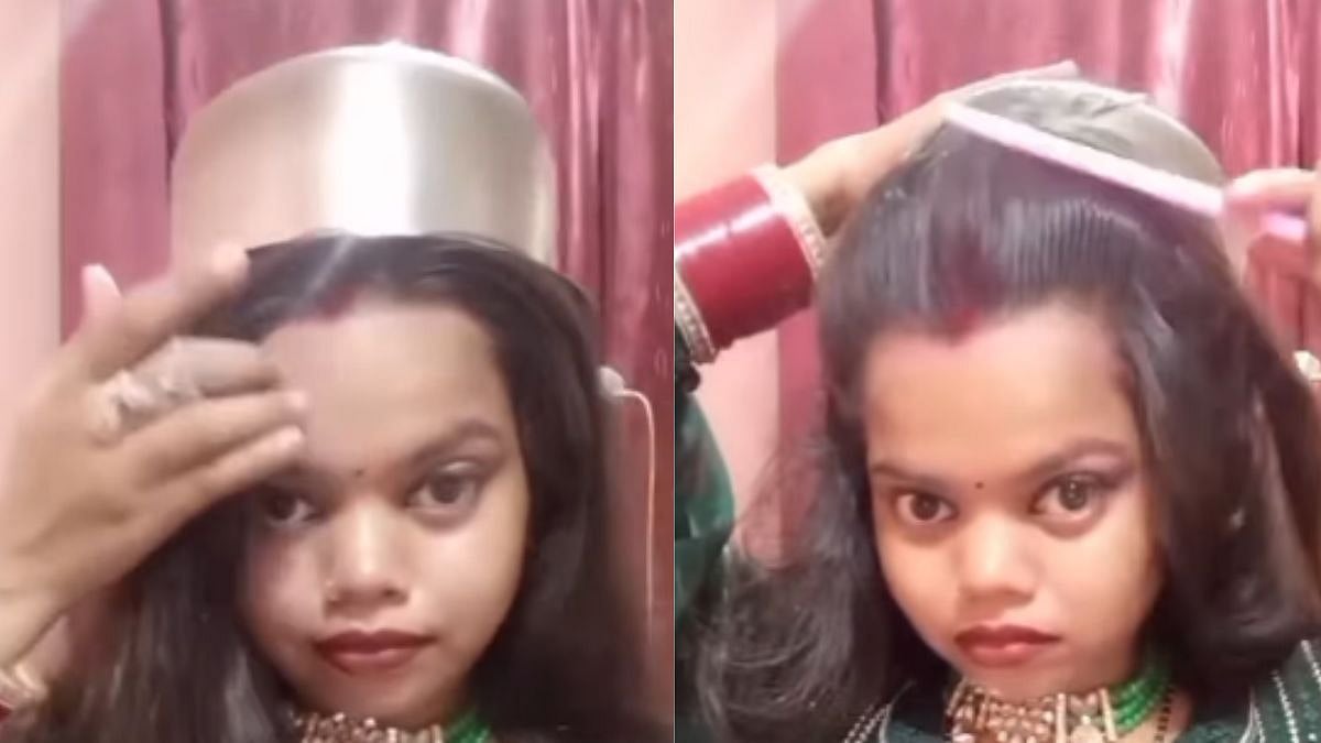 In the video, rather than simply standing ahead of a mirror and waving the comb through her hair, she does something quite unconventional. She brings in a kitchen bowl and places it on her head in a rather eye-catching manner.