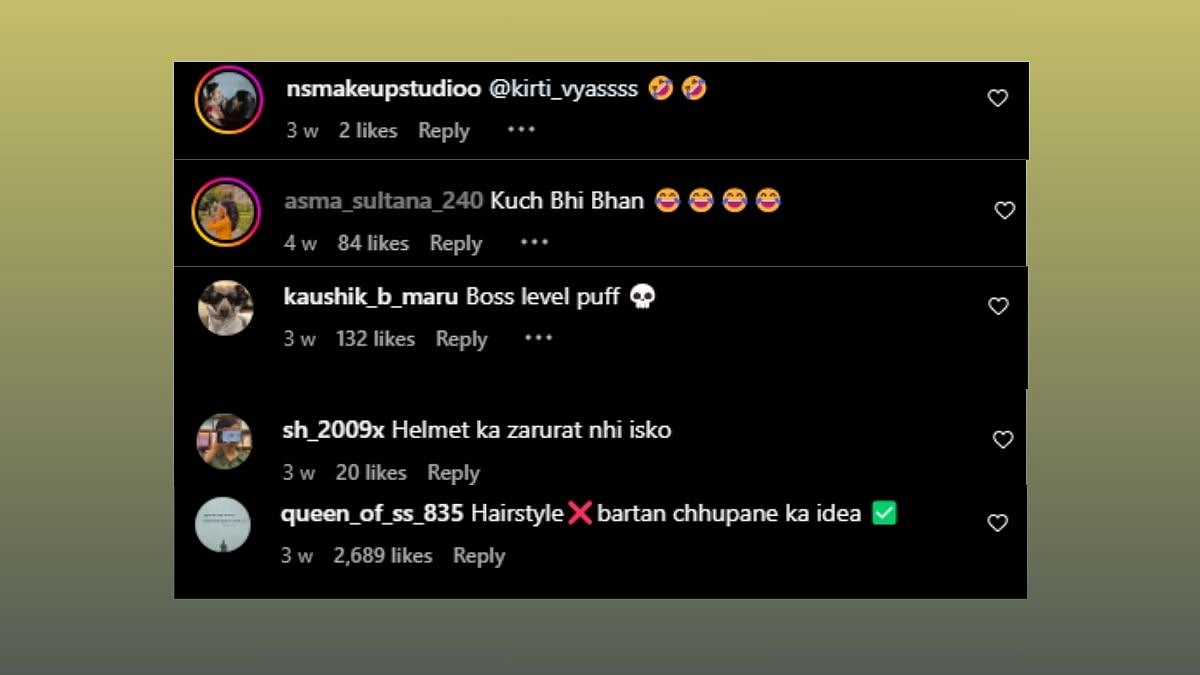 "Boss level puff," read one comment. "Helmet ka zarurat nhi isko (She doesn't need a helmet)," said another. Netizens reacted to the video by sharing laughter emojis.