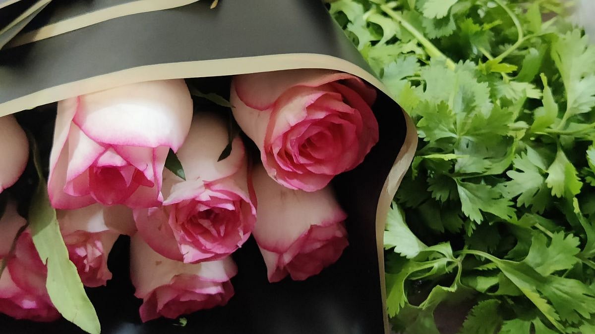 She might have been impressed with the beautiful rose bouquet, but what drew her attention immediately was something very desi. She came across a bundle of coriander leaves in the parcel bag. Strange combo, isn't it? "He sent me flowers and Swiggy sent free dhaniya with that bro why tf would I need that?", she wrote on X while sharing the incident online.