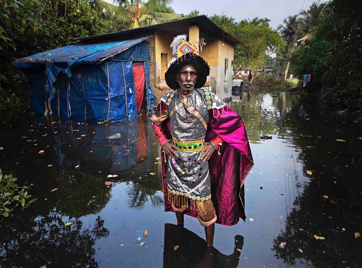 Unlike their aristocratic stage personas, the performers live in harsh realities. Dressed in grandeur yet standing in ankle-deep water, Sunil juxtaposes the actors against crumbling homes and rising tides—visual metaphors for a community grappling with climate change and cultural erosion.