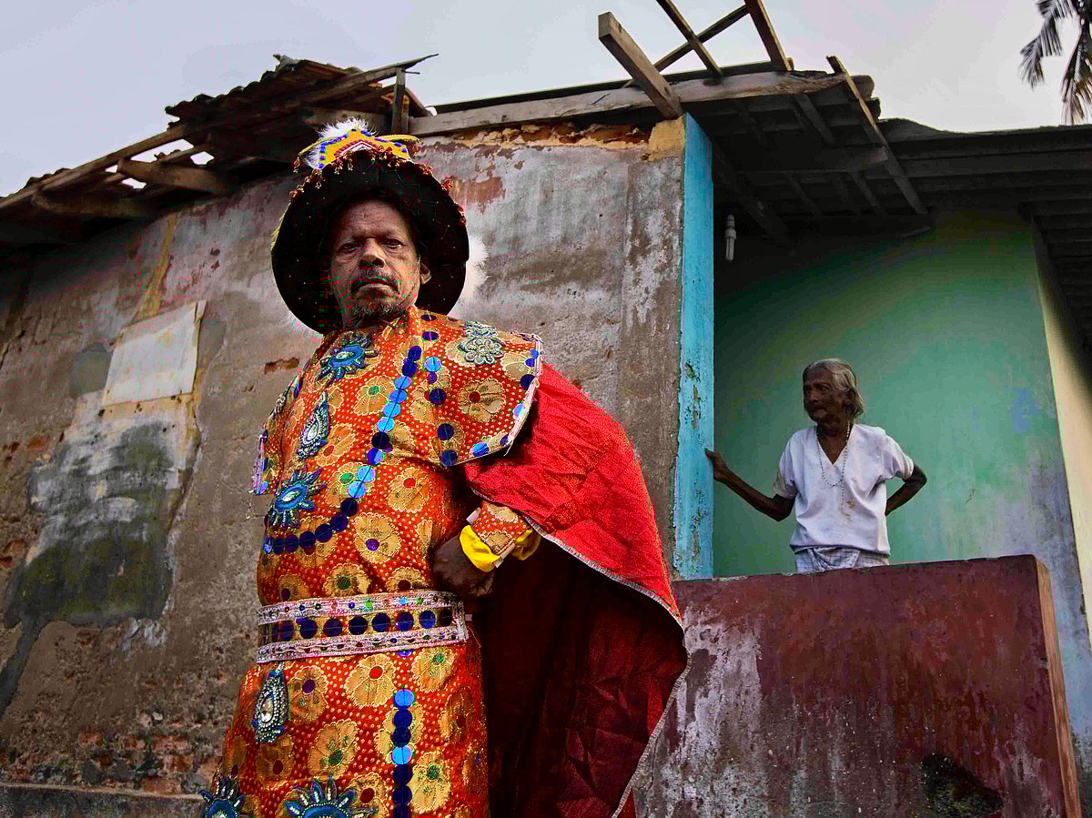 Viewers are drawn into the world of Chavittunadakam through Sunil’s lens, where striking portraits of the performers from the small Latin Christian fishing community of Chellanam, south of Kochi, embody both dignity and despair. These characters wear vibrant costumes adorned with cardboard and plastic crowns, with their hands on their hips, displaying cultural pride. Their solemn faces betray a deeper narrative: the looming threat to their homes and heritage.