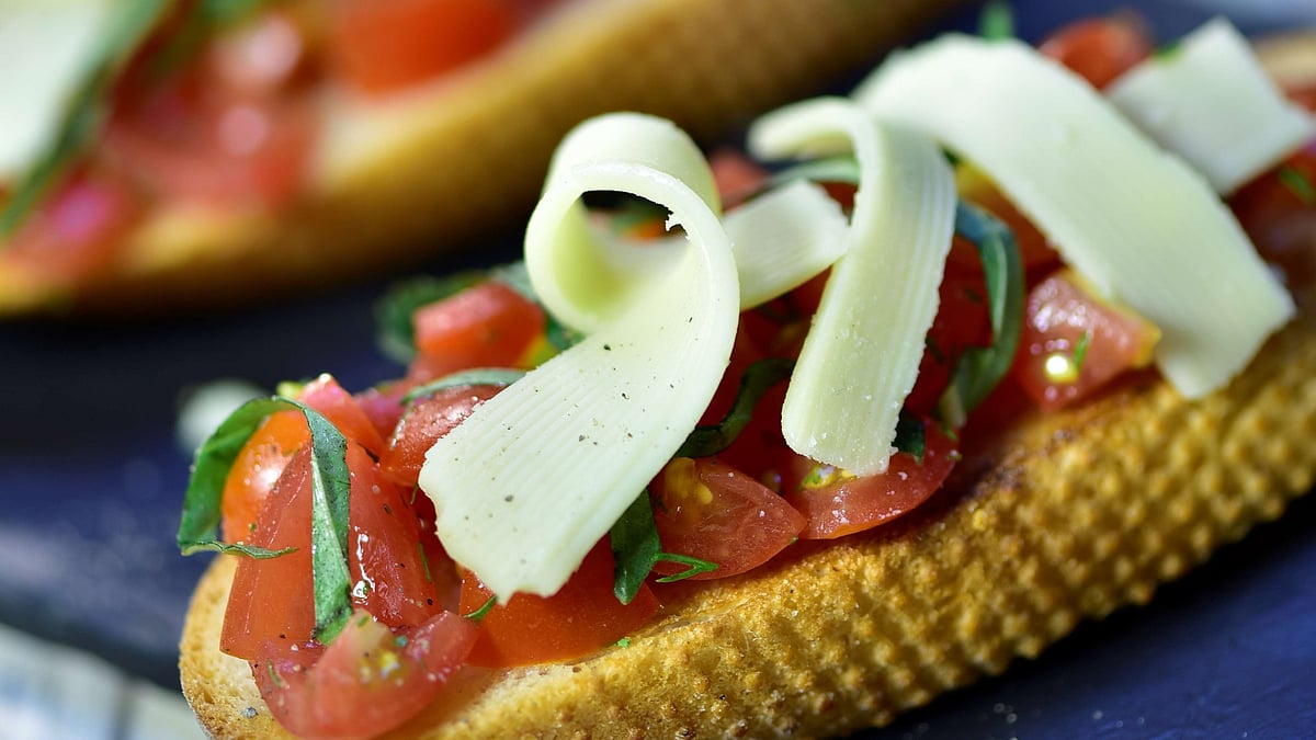 Method: Combine tomato, salt, pepper, honey, olive oil in a bowl and mix. Keep aside. Now cut the French baguette in slices and toast them lightly. Portion out the tomato mixture on each bread. Roughly tear some basil leaves and place on each bread. Last, top it off with cheddar cheese shavings. Serve immediately.