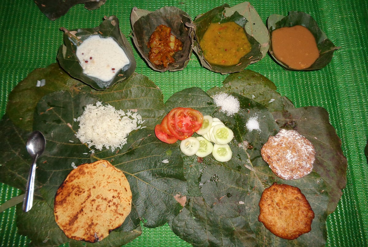 Influenced by the local tribes of Madhya Pradesh, the food was a classic style of preparation of tribal cuisine. The tribal women got together to whip up a thali for us using traditional methods like grinding kabit chutney on sil-bhatta, firing rotis and tikkad (thick whole wheat bread) and cooking a variety of dishes on chulhas. Kabit or kavit ki chutney is unmissable. Its unique zest comes from wood apple, senda namak, toasted cumin, fenugreek and fennel seeds with a little onion. All these ground together with green chillies, coriander leaves and jaggery make for a finger-licking relish.