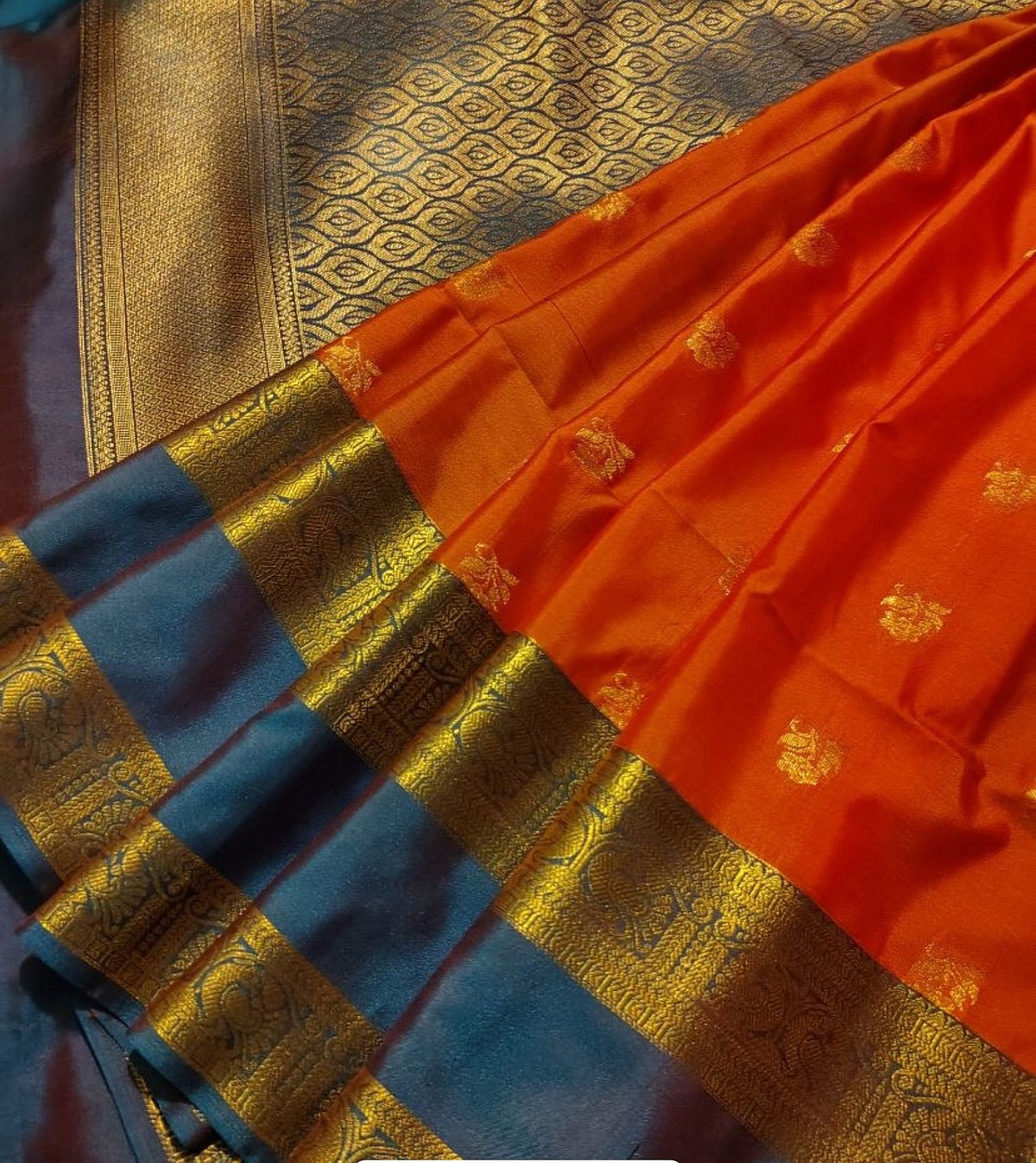 The refined sheen of heavy mulberry silk with signature temple borders in bright contrasting colours and pallu use peacock, parrot, swan, floral motifs, woven in timeless heirloom style. The seamless integration of ‘korvai’ technique and real silver/gold zari make it a prized possession, with a resale value. Worn for poojas, classical dance performances, weddings, it also comes in nine yards.