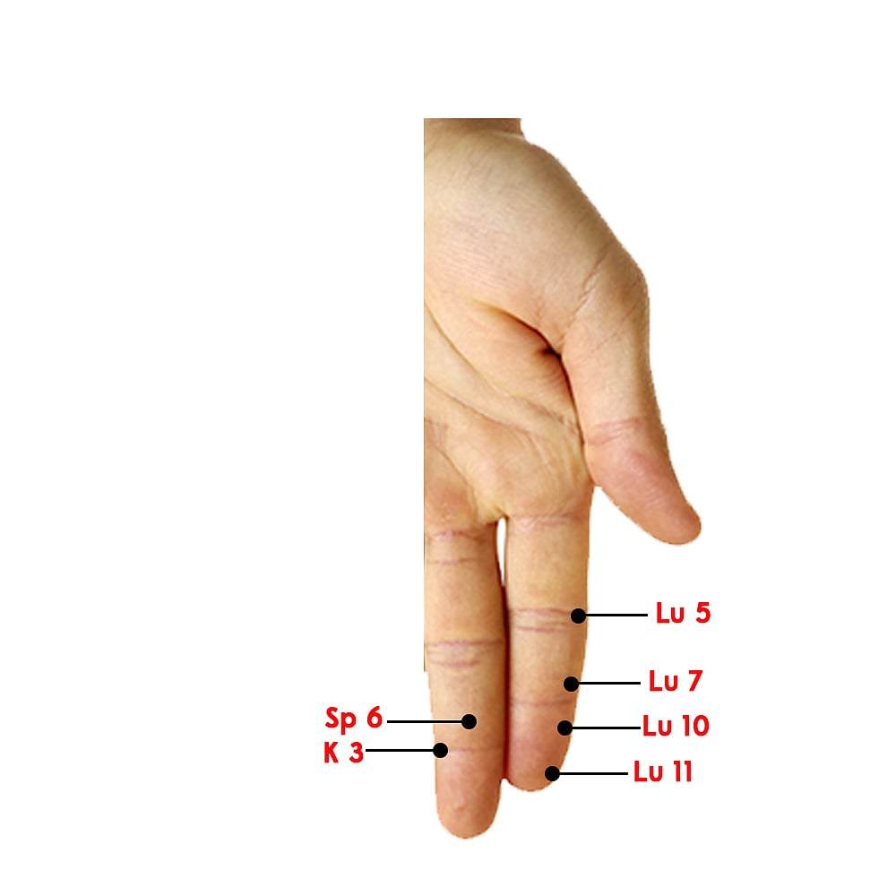 Cough: There are two types of coughs, dry and wet. A dry or sometimes tickly cough is one that does not bring up any phlegm or mucus. Dry coughs may cause a tickling sensation and are often due to irritation in the throat. Treat: Lu 10 ↓ During cold and flu season, coughs tend to be wet as our lungs are filled with mucus. Wet cough often transitions into dry cough that produces no mucus. Treat: Lu 5 ↓.