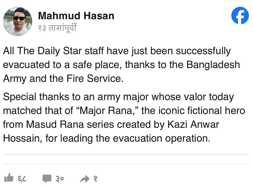 “All The Daily Star staff have just been successfully evacuated to a safe place, thanks to the Bangladesh Army and the Fire Service,” staff member Mahmud Hasan wrote on social media, praising the rescue effort. “Special thanks to an army major whose valor today matched that of “Major Rana,” the iconic fictional hero from Masud Rana series created by Kazi Anwar Hossain, for leading the evacuation operation,” he added.