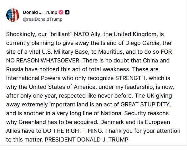 The United States President Donald Trump, who is on a spree to impose tariffs on nations that oppose his unilateral plans, hit out at the United Kingdom over its plan to transfer the island of Diego Garcia, home to a US military base, to Mauritius on Tuesday.