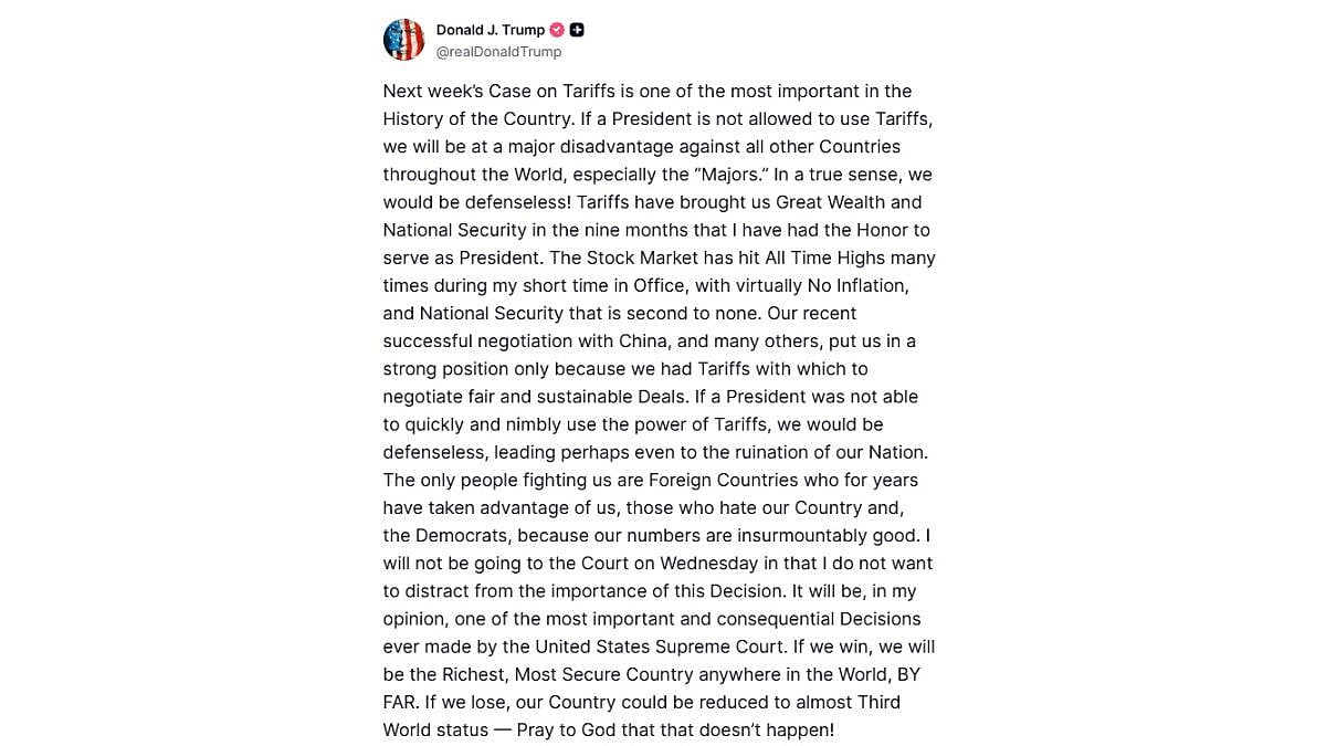 In a post on Truth Social, Trump wrote, "Next week's Case on Tariffs is one of the most important in the History of the Country. If a President is not allowed to use Tariffs, we will be at a major disadvantage against all other Countries throughout the World, especially the 'Majors.' In a true sense, we would be defenceless!"