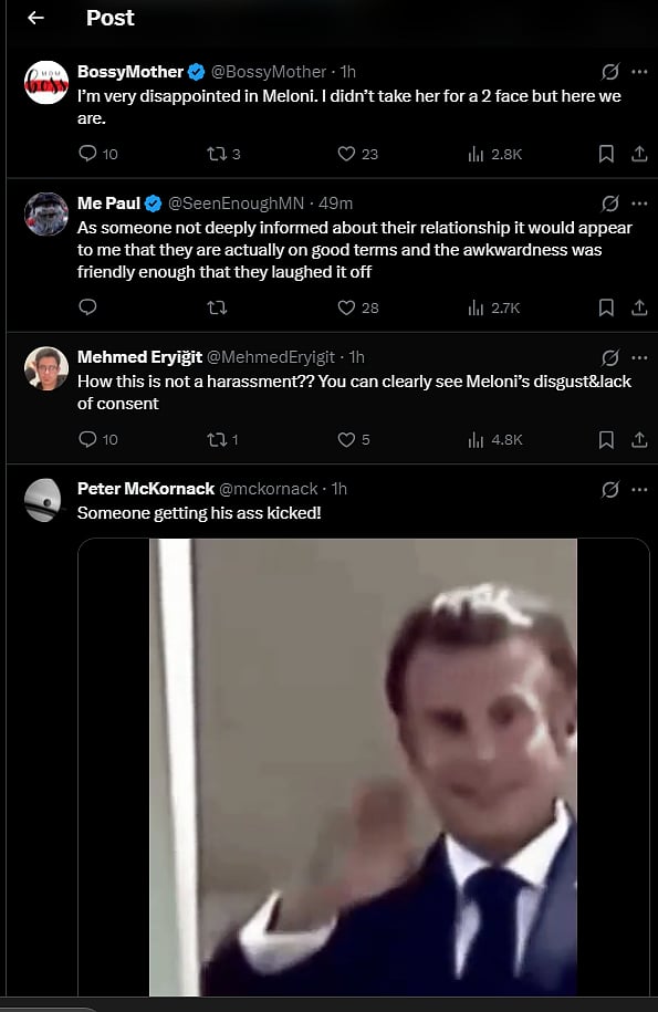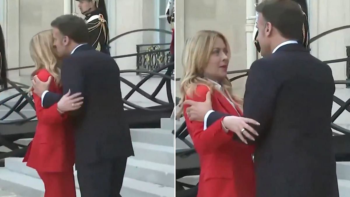 French President Emmanuel Macron greeted Italian Prime Minister Giorgia Meloni for high-stakes talks on Iran and the Strait of Hormuz in Paris, but the video of the two leaders meeting quickly went viral for all the wrong reasons.