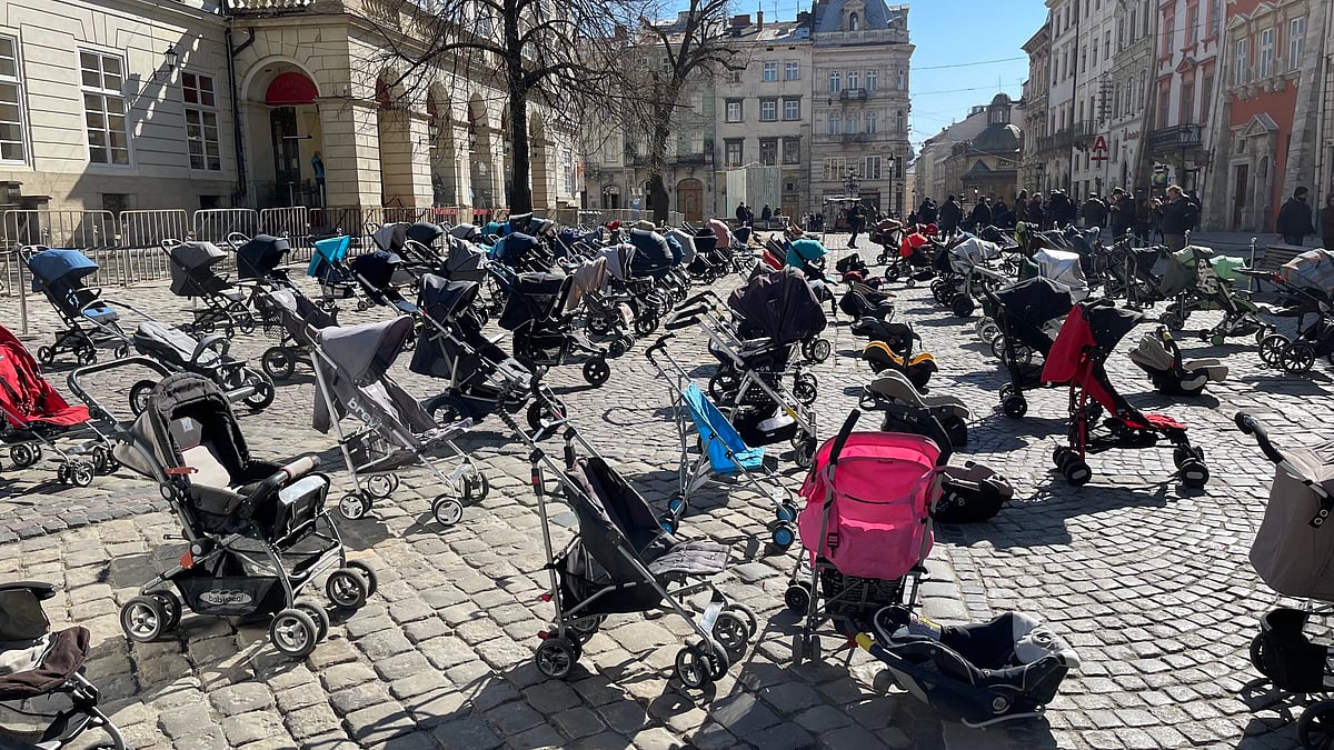 A display of over 100 strollers and car seats has been set up as a memorial in the center of the city of Lviv that officials say is meant to honor the children who have been killed in the weeks since Russia began its invasion of Ukraine.