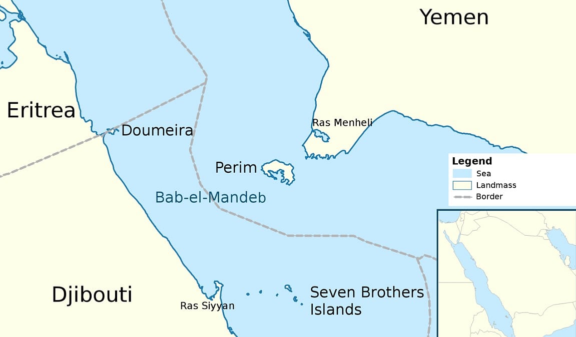 The Bab al-Mandeb is a strategic maritime "chokepoint" that connects the Red Sea to the Gulf of Aden and the Indian Ocean. Geographically, it sits at a critical crossroads between continents, separating the Arabian Peninsula (Yemen) from the Horn of Africa (Djibouti and Eritrea). It is roughly 100 kilometres long and narrows to just 30 kilometres at its tightest point.