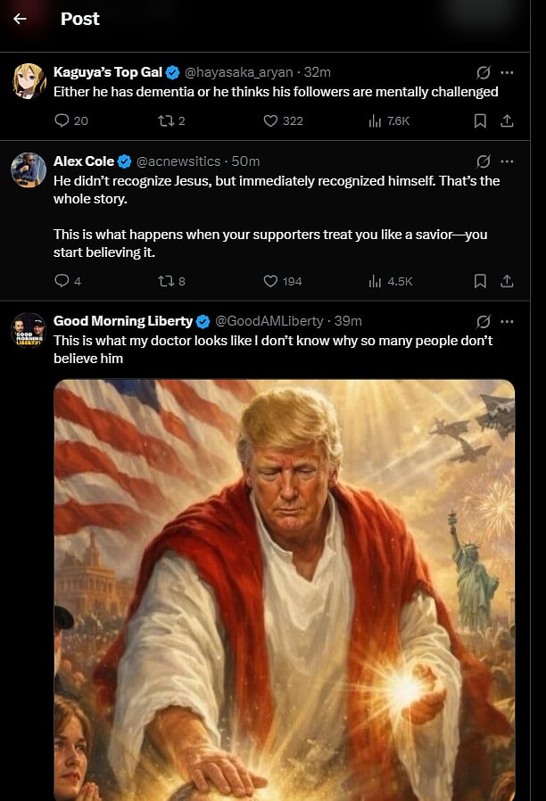 As soon as President Trump issued a statement regarding the ‘Jesus’ image, netizens on social media platform X strongly criticised the US President for depicting himself as Jesus Christ. Reactions ranged from criticism to ridicule, with one user commenting, “Either he has dementia or he thinks his followers are mentally challenged.”