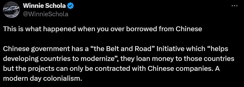 "This is what happened when you over borrowed from Chinese. Chinese government has a āthe Belt and Roadā Initiative which āhelps developing countries to modernizeā, they loan money to those countries but the projects can only be contracted with Chinese companies. A modern day colonialism," said @WinnieSchola.