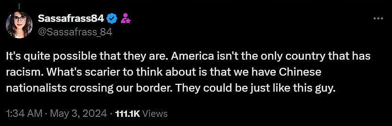 Another user @Sassafrass_84 said, "It's quite possible that they are. America isn't the only country that has racism. What's scarier to think about is that we have Chinese nationalists crossing our border. They could be just like this guy."