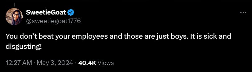 "You donāt beat your employees and those are just boys. It is sick and disgusting!" said @sweetiegoat1776.