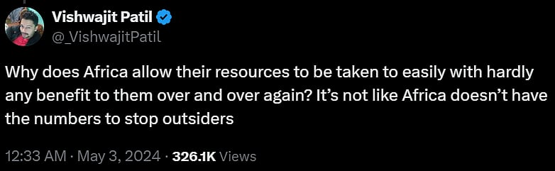 Commenting on the video one user @_VishwajitPatil said, "Why does Africa allow their resources to be taken to easily with hardly any benefit to them over and over again? Itās not like Africa doesnāt have the numbers to stop outsiders"