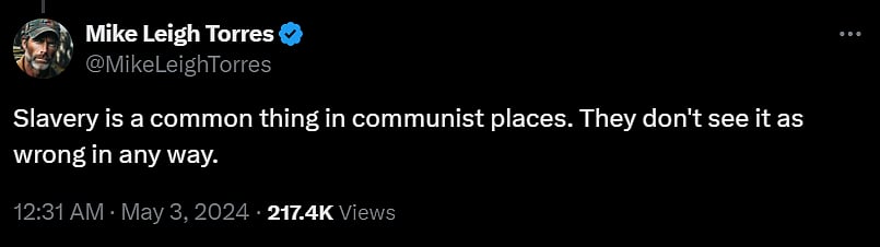 "Slavery is a common thing in communist places. They don't see it as wrong in any way," said @MikeLeighTorres.