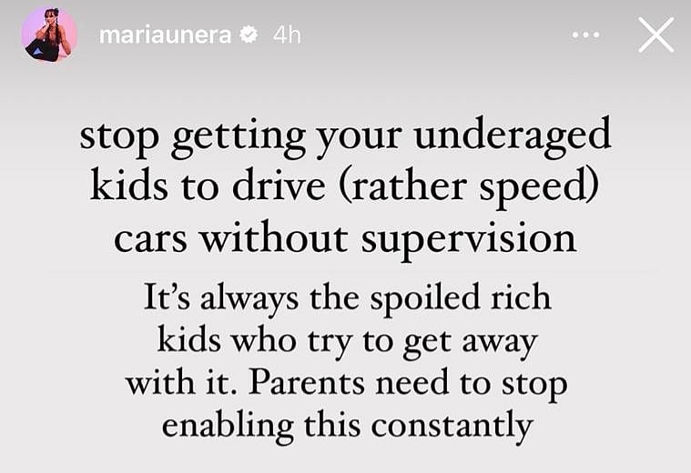 Singer Maria Unera called on people to prevent their underage children from driving unsupervised. She wrote, "It's always the spoiled rich kids who try to get away with it," and emphasized that parents need to stop encouraging this behavior.