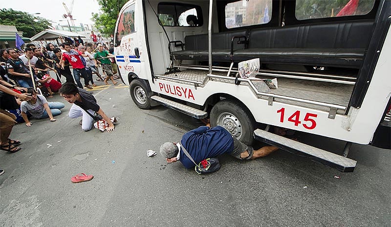 At least three student activists had to be taken to a hospital after they were run over by the van driven by a police officer, protest leader Renato Reyes said. AP Television footage showed the van repeatedly ramming the protesters as it drove wildly back and forth after protesters had surrounded and started hitting the van with wooden batons they had seized from the police.