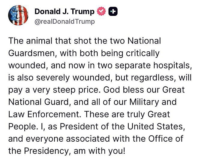 Trump, who was in Florida for Thanksgiving, warned in a statement on social media that the "animal" who shot the guard members "will pay a very steep price." "God bless our Great National Guard, and all of our Military and Law Enforcement. These are truly Great People," Trump wrote on Truth Social. "I, as President of the United States, and everyone associated with the Office of the Presidency, am with you!" In Fort Campbell, Kentucky, Vice President JD Vance urged "everybody who's a person of faith" to pray for the two Guard members. He cautioned that much remained unknown, including the motive of the shooter.