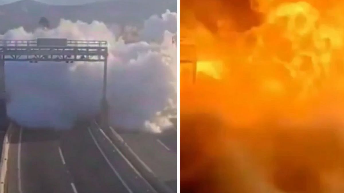 The viral video shows the tanker sliding onto its side before a massive vapor cloud billows outward at high speed, resembling thick fog rolling across the roadway. Several vehicles, including cars and a motorcycle, were caught directly in its path.