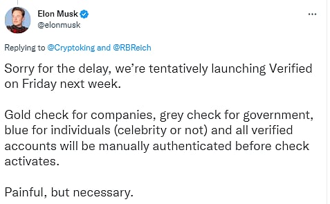 During late November, Elon Musk had clarified what the three colour ticks indicate. He tweeted, "Gold check for companies, grey check for government, blue for individuals (celebrity or not) and all verified accounts will be manually authenticated before check activates."