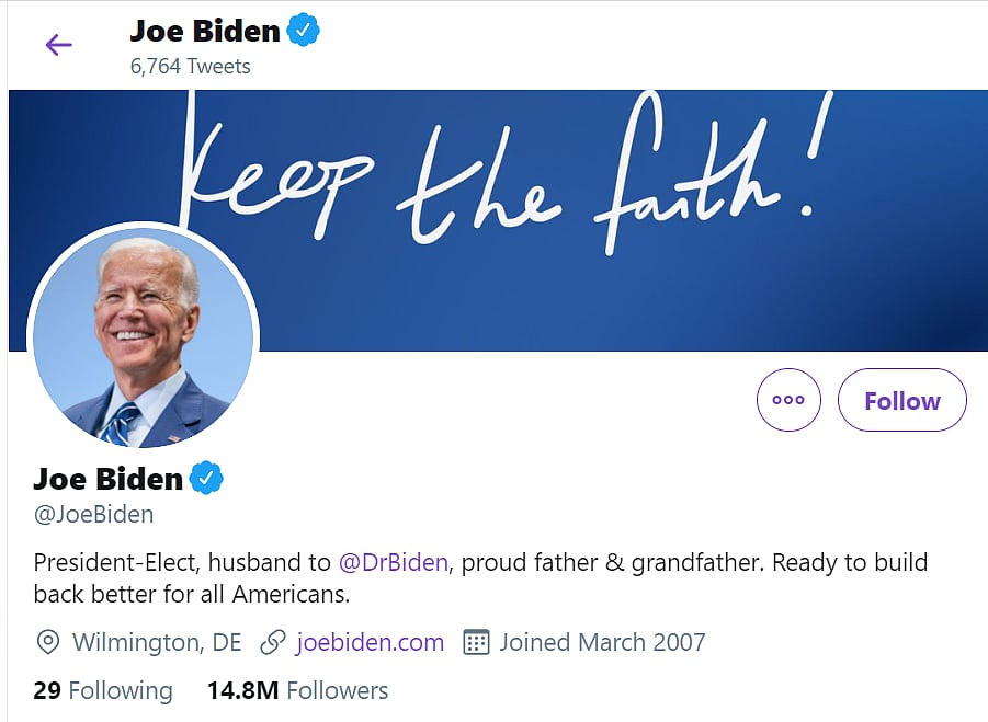 The President-Elect changed his bio to "President-Elect, husband to @DrBiden proud father & grandfather. Ready to build back better for all Americans."