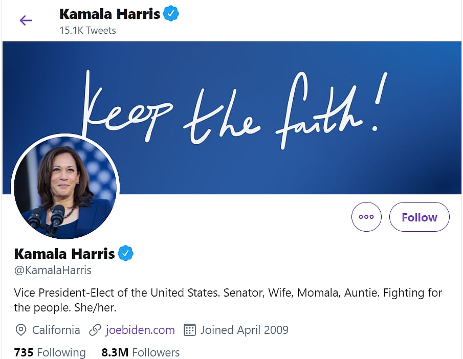 "Vice President-Elect of the United States. Senator, Wife, Momala, Auntie. Fighting for the people. She/her," read Harris' new bio as she is set to become the Vice President of the US.
