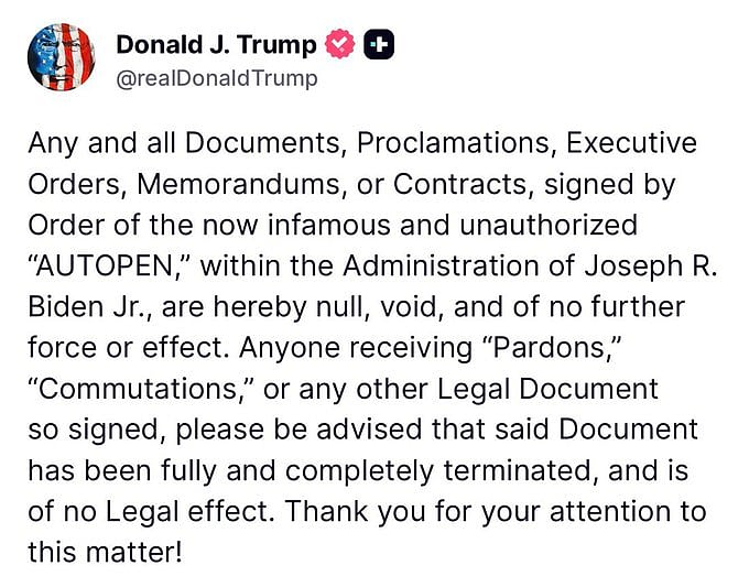 "Any and all Documents, Proclamations, Executive Orders, Memorandums, or Contracts, signed by Order of the now infamous and unauthorized "AUTOPEN," within the Administration of Joseph R. Biden Jr., are hereby null, void, and of no further force or effect." Trump said in a post on his social media platform, Truth Social.