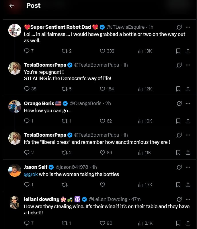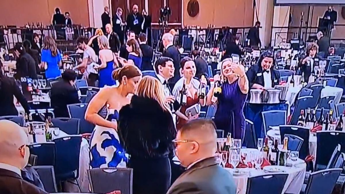 In the clip, a few members of the press are seen laughing and clicking selfies following the shooting, while others are leaving the venue as hotel staff clear the hall. Some are seen holding bottles of wine while taking photos, as if nothing had happened. A woman in a black coat is also seen walking up to a table and grabbing not just one, but two bottles of wine before walking away.