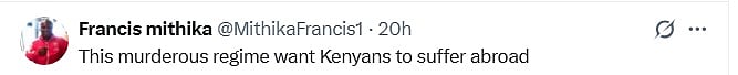 "This murderous regime wants Kenyans to suffer abroad," another X user commented.
